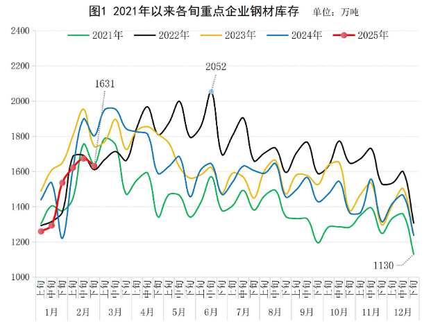 2025年2月下旬,重點統計鋼鐵企業(yè)(以下簡稱“重點企業(yè)”)鋼材庫存量1631萬噸,環(huán)比上一旬減少42萬噸,下降2.5%;比年初增加394萬噸,增長31.9%;比上月同旬增加96萬噸,增長6.3%;比去年同旬減少171萬噸,下降9.5%,比前年同旬減少111萬噸,下降6.4%(見圖1)。