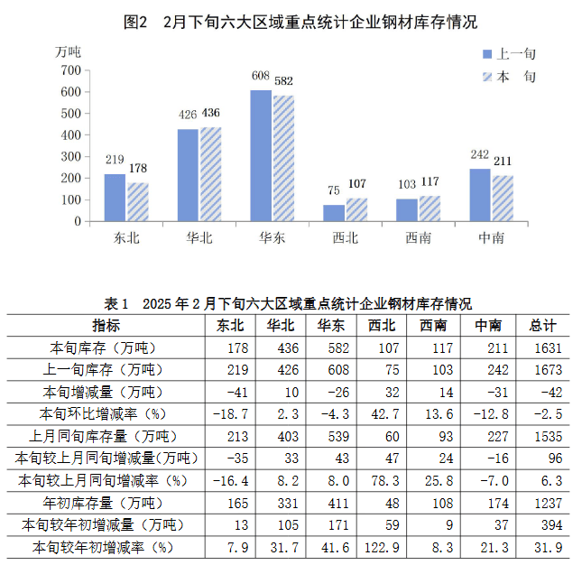 2月下旬六大地區(qū)中,華北、西北、西南地區(qū)重點企業(yè)鋼材庫存較上一旬有不同程度增長,其它地區(qū)均有不同程度下降(見圖2、表1),具體情況為: